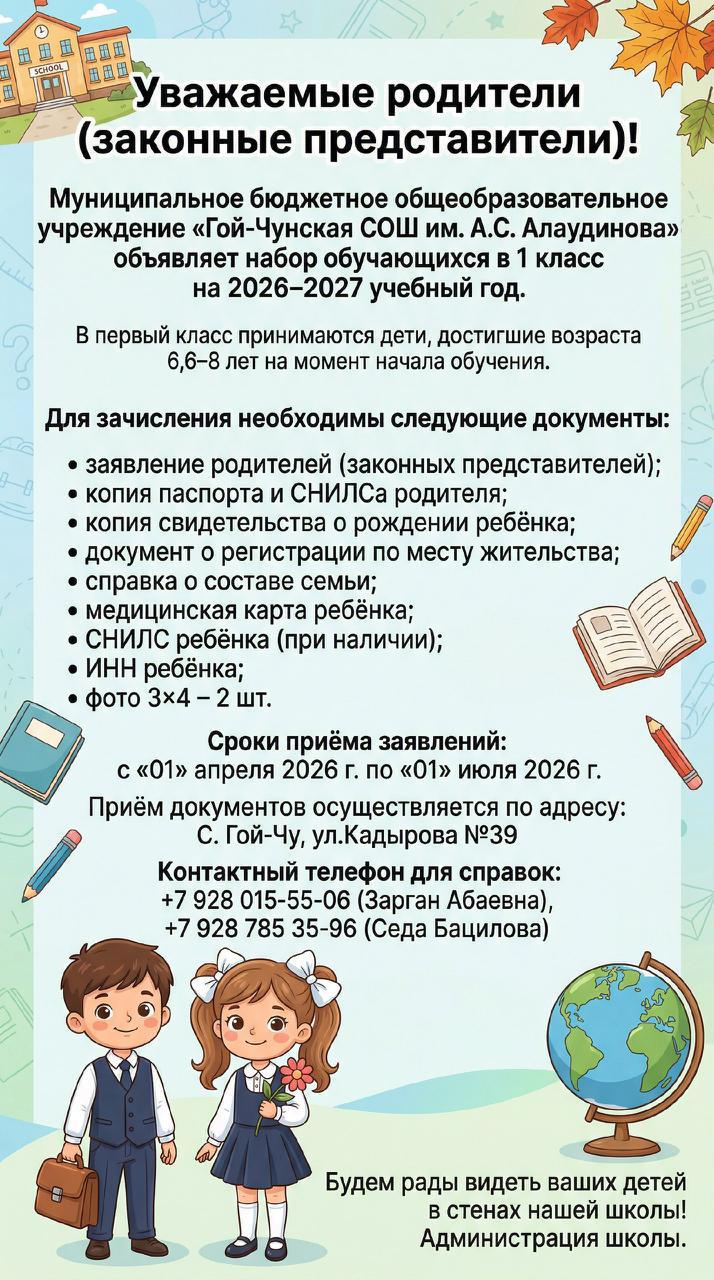 Я рада приветствовать вас на официальном сайте МБОУ "Гой-Чунская СОШ им.А.С.Алаудинова"! На страницах нашего сайта каждый может найти интересующую его информацию, и просто "пролистать" жизнь школы, которая отражена фото, видео материалами ну и для желающих почитать - текстом! На страницах нашего сайта ученики, как и их родители, могут просмотреть план общеобразовательных мероприятий, а также олимпиад и других мероприятий, связанных с жизнью школы. Родители могут проконтролировать деятельность своего ребенка, узнать о его расписании дня, кружках и сообществах, в которых участвует их ребенок. Для тех, кто желает ознакомиться с нормативно-правовой базой школы, мы рады представить раздел "документы", в котором представлены все документы, регламентирующие нашу деятельность: приказы, положения и регламенты! Разделы "Учебная деятельность", "Дополнительное образование", "Наука и творчество" дадут вам возможность наглядно просмотреть особенности преподавания в нашей школе.