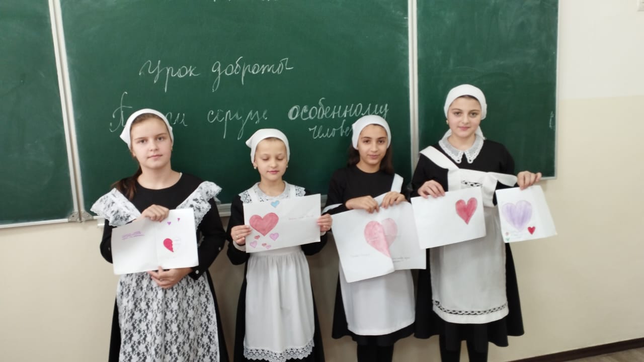 С целью формирования культуры позитивного ,толерантного отношения в обществе к лицам с инвалидностью и ограниченным возможностями здоровья в МБОУ "Гой-Чунская СОШ им.А.С.Алаудинова" 6 декабря были провелены Уроки доброты ,приуроченные к Международному дню инвалидов.